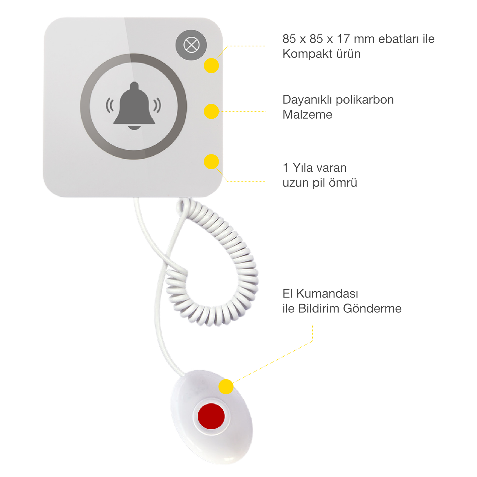 Hasta ve yaşlı bireylerin WC, banyo vb. yerlerde acil durumlarda yardım çağrısında bulunabilmeleri için tasarlanmıştır. Hasta ve yaşlı bireyler ihtiyaç halinde el kumadasını kullanarak veya buton üzerindeki tuşa dokunarak bildirim gönderebilir.