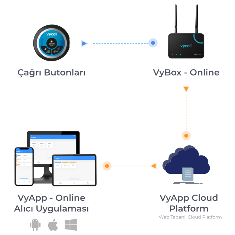 VyBox - Online Gateway entegrasyonu sayesinde kablosuz çağrı butonlarından gelen sinyaller, güvenli bir şekilde internet üzerinden VyApp Online Platformuna iletilir. Bu özellik, alıcıların mesafe sorunu olmadan her yerden bildirimlere ulaşabilmesini sağlar.